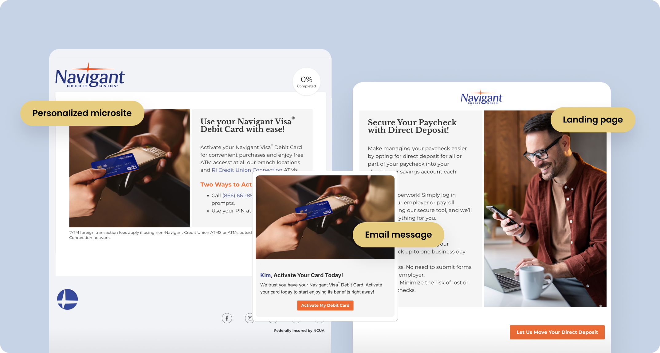Instead of relying on printed welcome kits, Navigant now delivers personalized microsites tailored to each member’s account type and onboarding stage. These microsites are part of a strategic 40-day sequence of email and text communications that guide members through key setup steps.